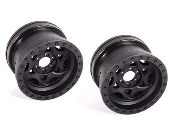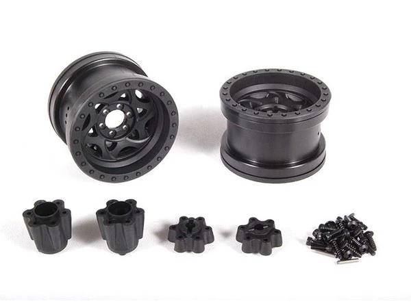 Officially licensed Walker Evans beadlock wheels dressed in an aggressive all black style are easy to assemble and they work with most 2.2 tires. The hub design allows this wheel to mount to any Wraith, or AX10. Our IFD™ (Interchangeable Face Design) wheel system makes it easy to dress it up with a new look.