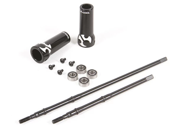 The AR60 OCP Full Width Axle Adapter Set widens the AR60 axles, creating an equal front and rear track width on 1/10th scale YETI vehicles. This enables the use of any 12mm wheel to be used on your 1/10th scale YETI without the use of special wheel adapters. The kit comes with extended steel axles, black anodized aluminum axle housing extenders, four cartridge bearings and all necessary hardware.