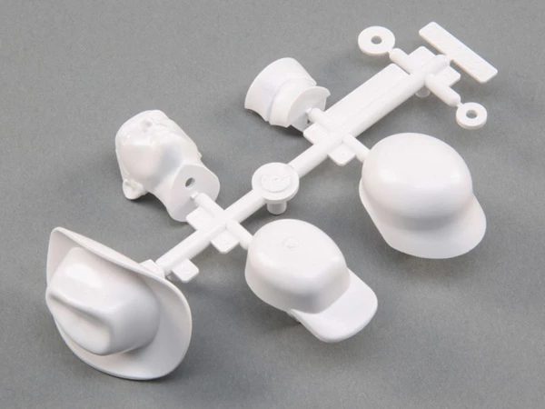 Plastic molded head with three hat options – a military style helmet, ball cap, and cowboy hat.