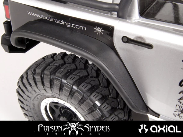 Check out Axial’s officially licensed Poison Spyder Customs Crusher Flares. These molded plastic tube rear fender flares add style and function to any scale off-road vehicle. Great approach and departure angles help when navigating tight technical terrain. Crusher Flares mount with five button head screws that tie into a molded plastic backing to fully capture the polycarbonate body for strength and durability.